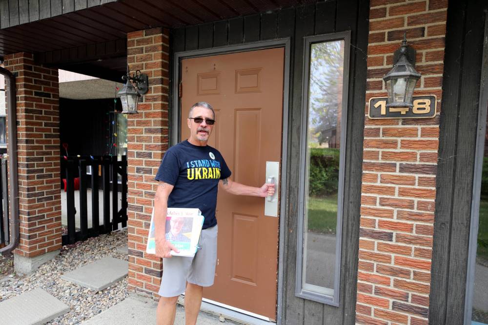 Bill Marsh, Brandon's only Green Party candidate, visits residences in Brandon West earlier this week. (Colin Slark/The Brandon Sun)