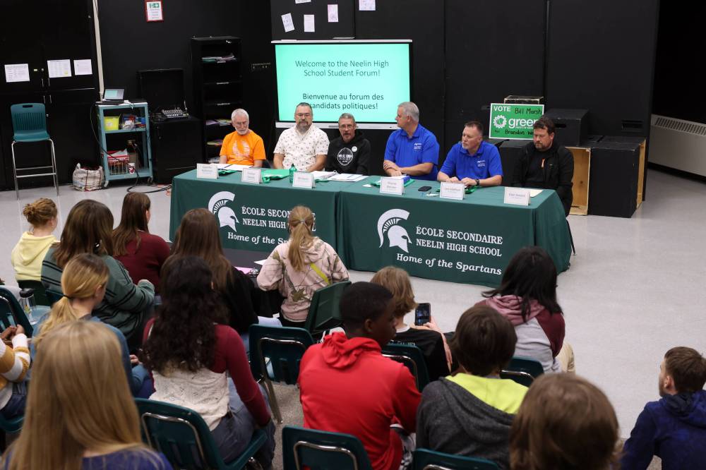 École secondaire Neelin High School students grilled Brandon West candidates Bill Marsh (Green Party), Wayne Balcaen (Progressive Conservative), Quentin Robinson (NDP) and Brandon East candidates Trenton Zazalak (Liberal), Glen Simard (NDP) and Len Isleifson.