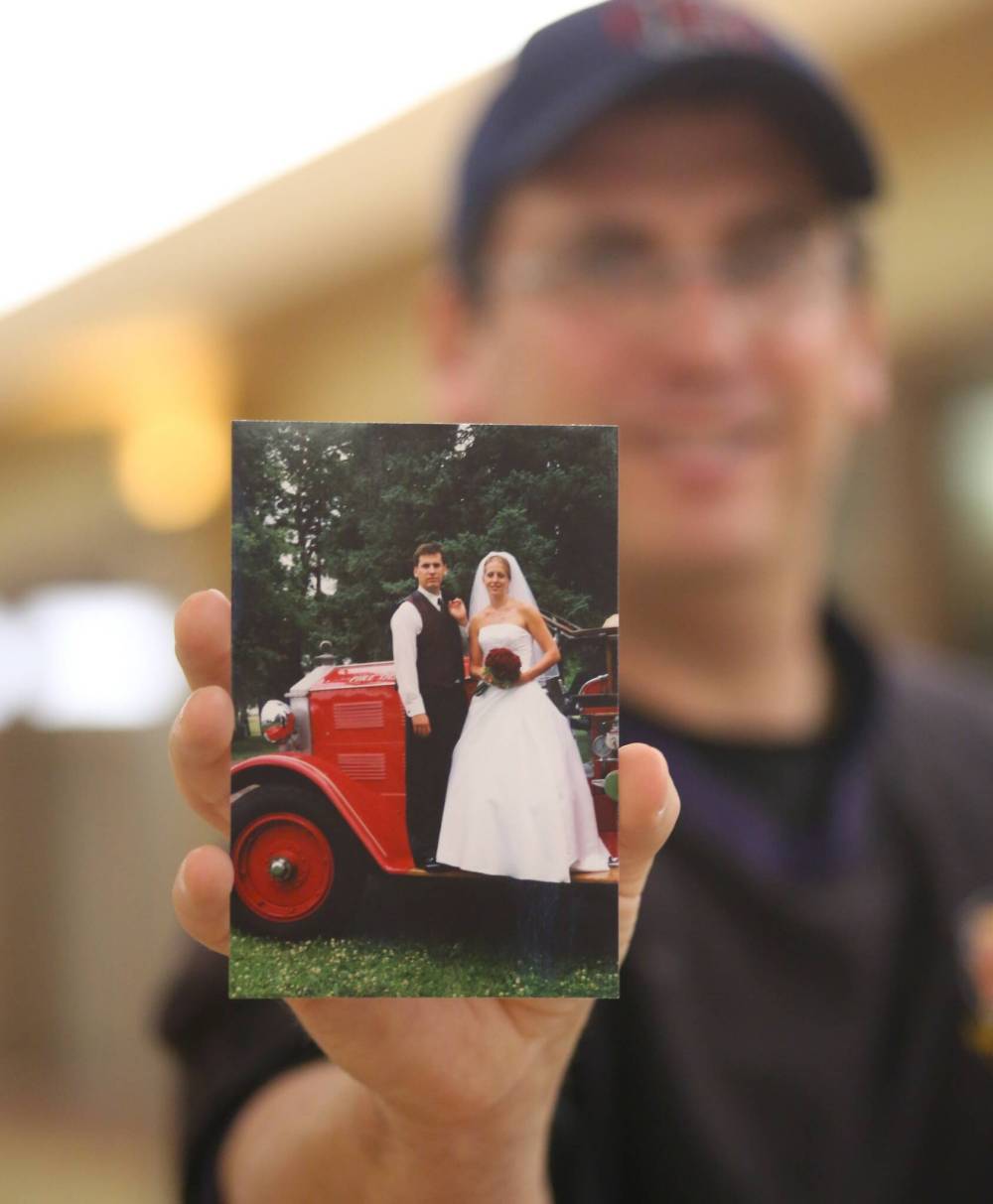 Garrioch holds a wedding photo with his wife Fiona, taken July 16, 2005, in front of the 1929 Bickle fire truck. (Matt Goerzen/The Brandon Sun)