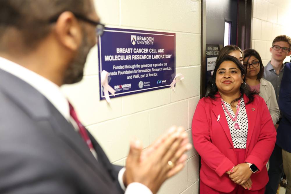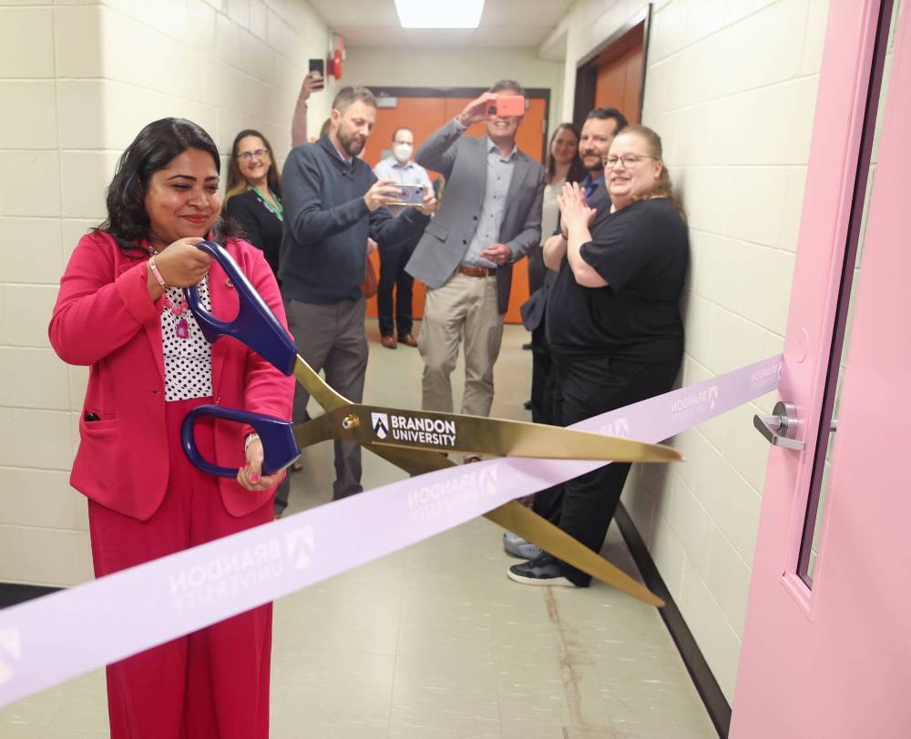 Dr. Mousumi Majumder, Canada Research Chair in Genotoxicology at Brandon University, cuts a ribbon to unveil the BU Breast Cancer Cell and Molecular Research Laboratory at the university on Wednesday. The lab will be run by Majumder. (Photos by Tim Smith/The Brandon Sun)