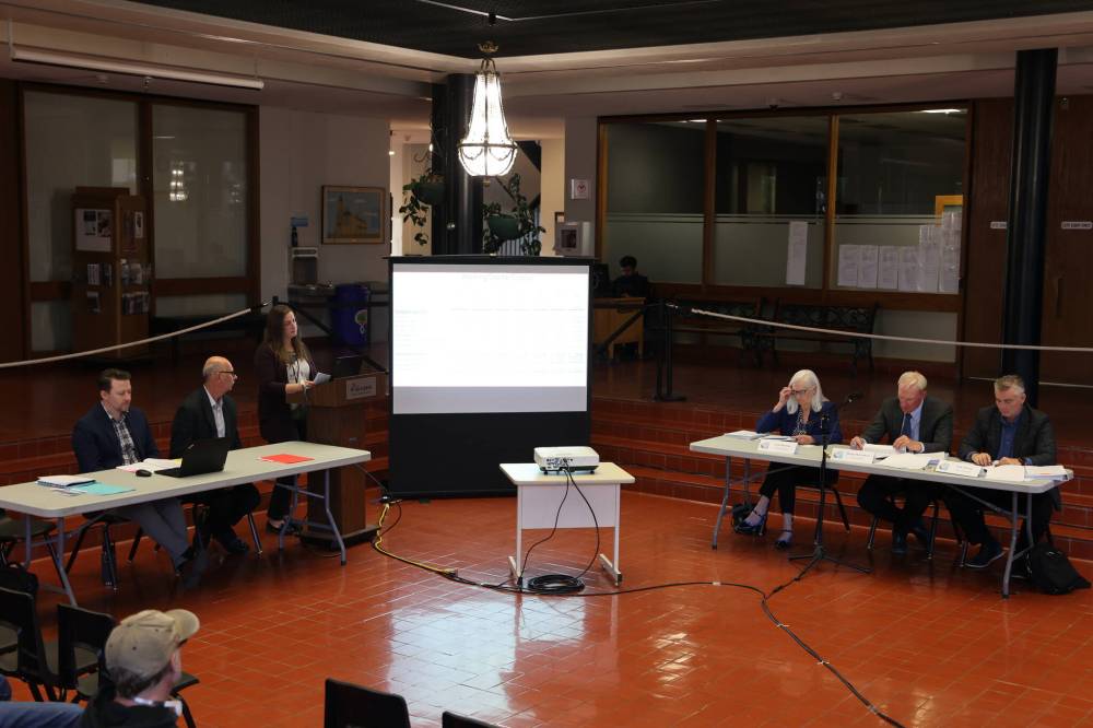 Staff from the City of Brandon (left) make their case for proposed water and wastewater utility rate increases as representatives of the Public Utilities Board (right) listen at a public hearing last month. In a decision issued last Friday, the PUB approved the rate application but criticized the city's handling of the utility's finances. (File)