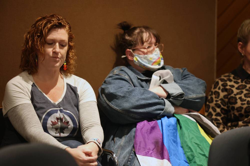 Two audience members, one holding a 2SLGBTQIA+ ally flag, listen to a presentation at Monday's Brandon School Division board of trustees meeting objecting to queer history being taught in local schools. (Colin Slark/The Brandon Sun)