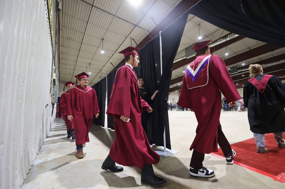 Assiniboine Community College graduates walk into the Manitoba Room at the Keystone Centre at the start of their grad ceremony on Friday afternoon.