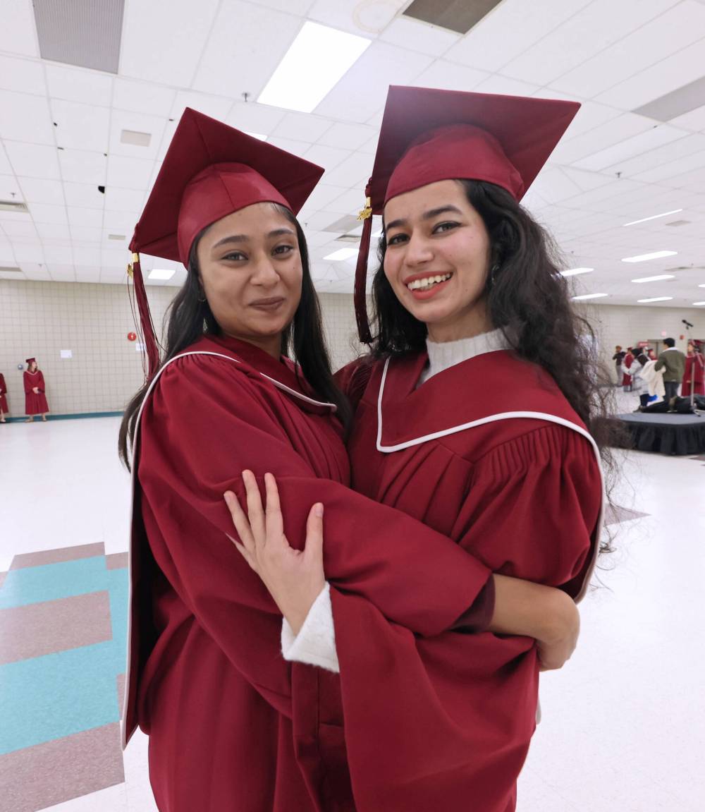 Students Himani Himani (left) and Harnoor Brar hug for a picture shortly before the ceremony. The two women earned an advanced diploma in Sustainable Food Systems from the college.