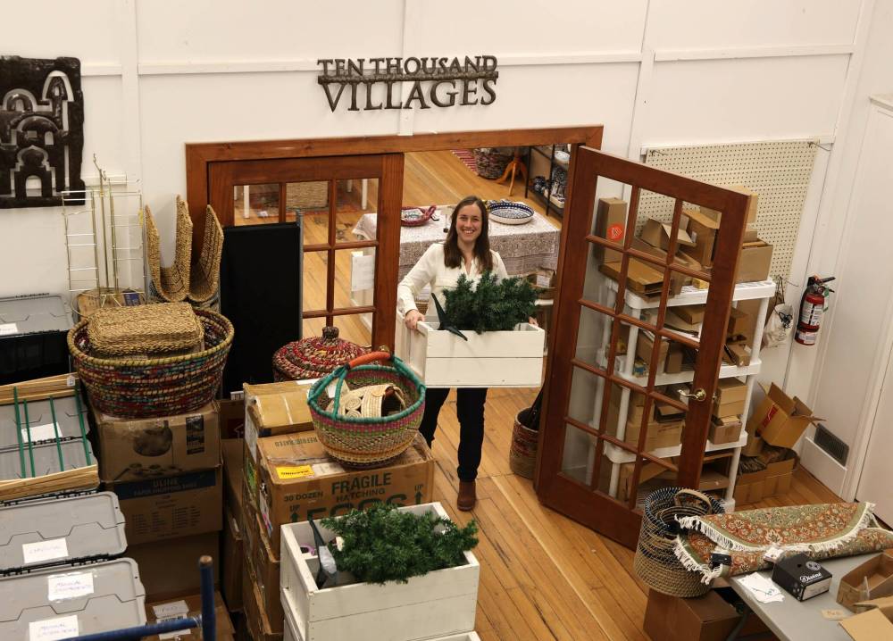 Ten Thousand Villages Brandon store manager Stephanie De la Luz carries a box with a Christmas tree on Wednesday, while preparing for the store's inaugural Children's Holiday Stop and Shop, which takes place from 1 to 4 p.m. on Dec. 2. (Michele McDougall/The Brandon Sun)
