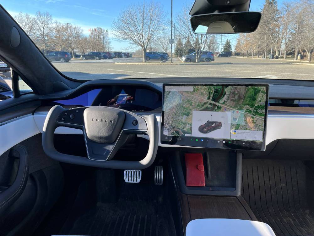The interior of Chris and Michelle Budiwski's 2022 Tesla Model S Long Range showing the navigation computer and yoke-style steering wheel.