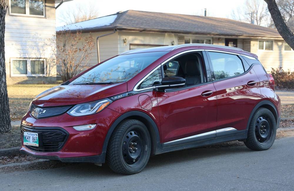 Quentin and Madelyn Robinson's 2020 Chevrolet Bolt electric car parked on a street in Brandon.