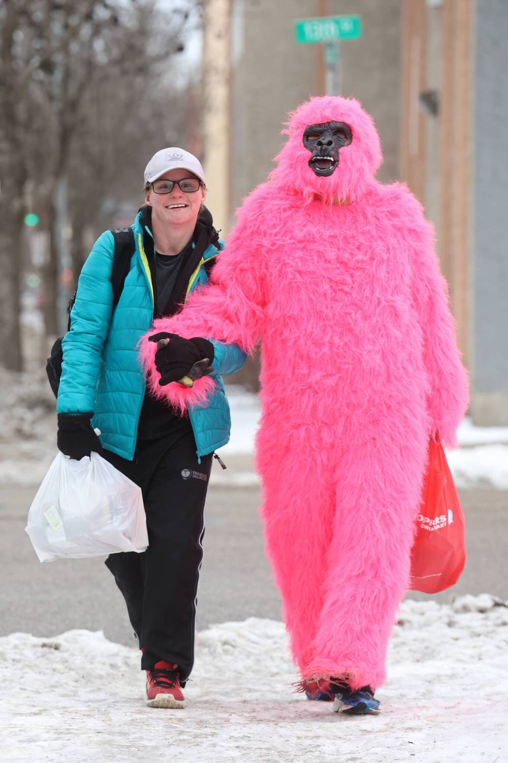 Laurissa Poets walks along Rosser Avenue with a friend in a pink gorilla costume on a grey yet mild Friday afternoon. (Tim Smith/The Brandon Sun)