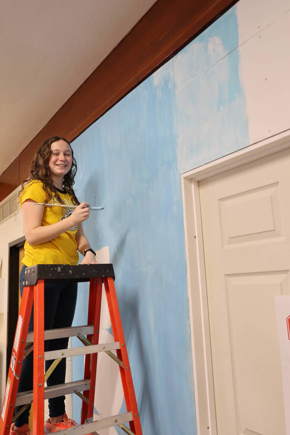 Grade 8 studet Kate Coley stands on a ladder to paint the mural on a temporary wall put up at École Harrison School.