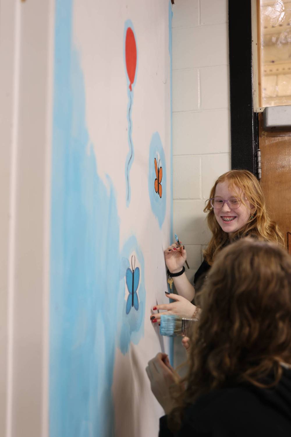 Grade 8 student Rowan Little paints a butterfly on the mural at École Harrison School.