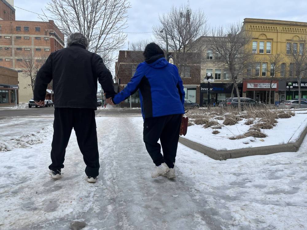 An unidentified couple hold onto each other for support on an icy sidewalk on Ninth Street in downtown Brandon on Tuesday afternoon. (Michele McDougall/The Brandon Sun)