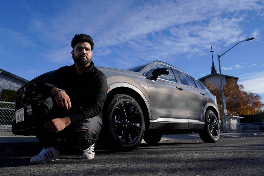 Shalinder Singh poses for photos in front of a 2024 Honda CR-V Hybrid in Sunnyvale, Calif., earlier this month. Like many hybrid buyers, Singh, an Uber driver, said that for him, the gas savings helped tip the price equation in favour of a Honda CR-V hybrid over the corresponding gasoline model. (Photos by The Associated Press)