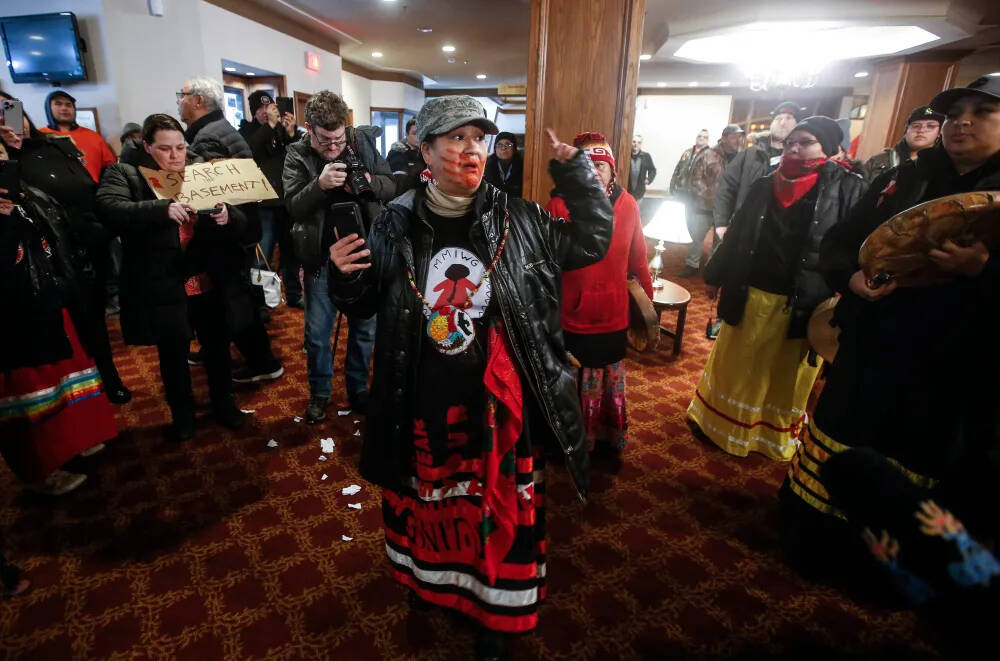 As a large crowd of protesters sang Indigenous songs, pounded drums and called for justice in the lobby, a separate group split off and went downstairs.