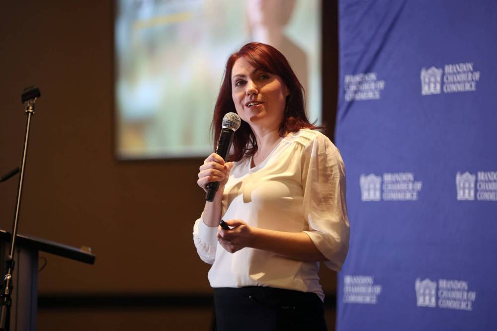 Katrina German, founder and CEO of Ethical Digital, delivers a talk titled "How Artificial Intelligence is Shaping the Future of Business" during the Brandon Chamber of Commerce luncheon at the Victoria Inn on Thursday. (Tim Smith/The Brandon Sun)