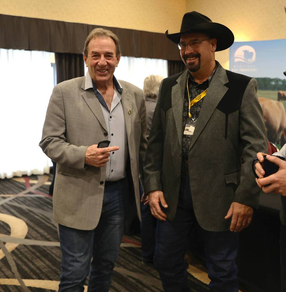 Manitoba Agriculture Minister Ron Kostyshyn stands next to Manitoba Beef Producers treasurer Mark Good during the annual general meeting for the province-wide association at Brandon's Victoria Inn on Thursday. (Michele McDougall/The Brandon Sun)