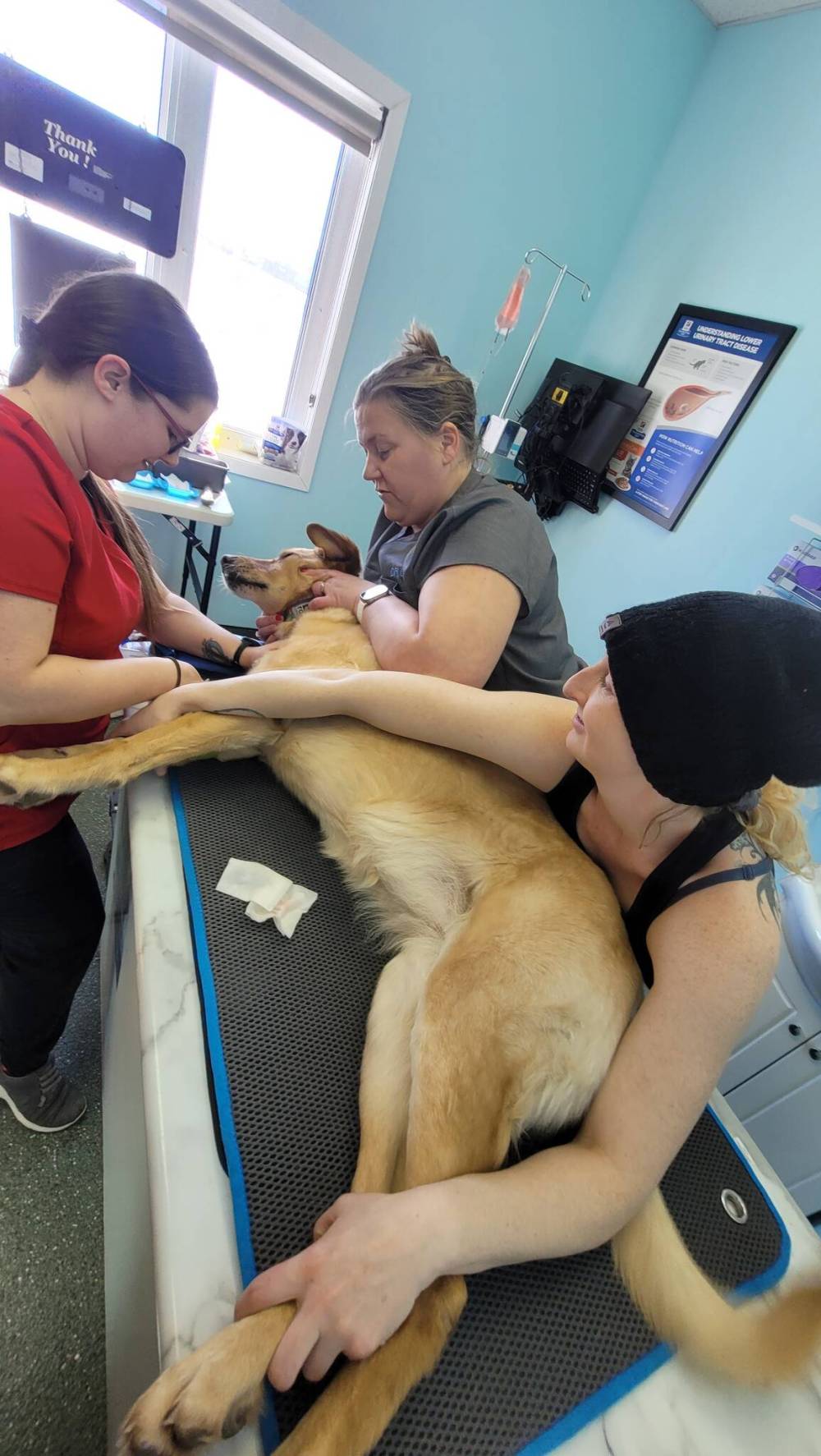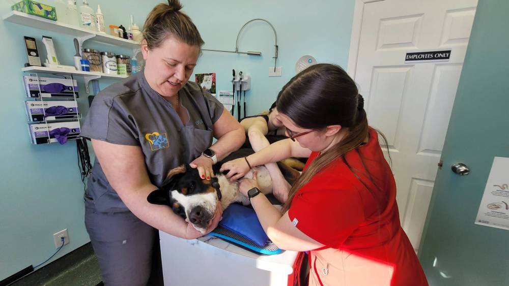 Brave dog blood donor Finley holds still under the gentle hands of her owner, the Neepawa Vet Clinic's Dr. Liz Ostendorf (left), Canadian Animal Blood Bank regional unit manager Paige Orser (right) and volunteer Danielle Deslauriers (centre) on Tuesday. (Miranda Leybourne/The Brandon Sun)