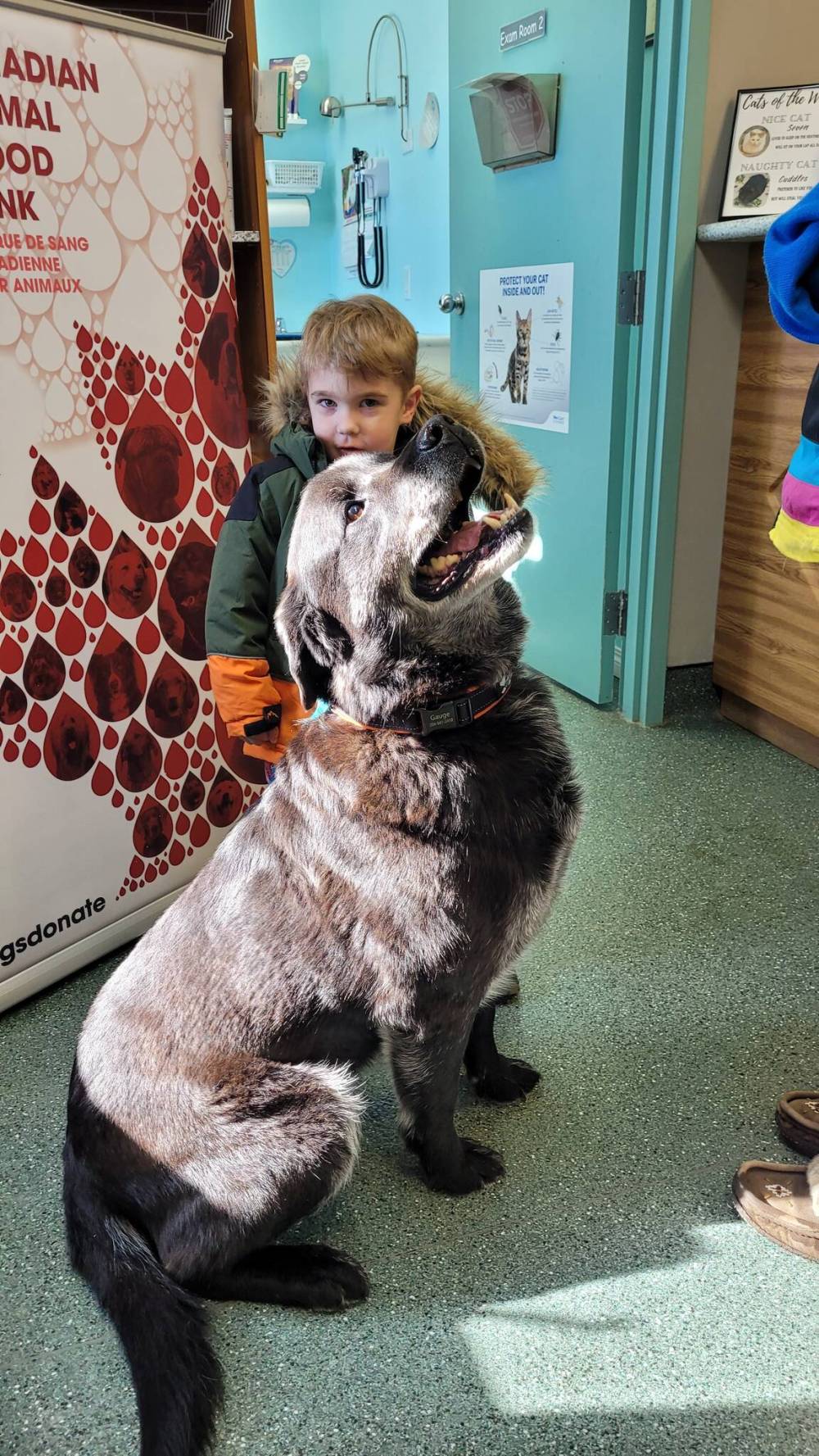 Gauge, a seven-year-old Rottweiler/Great Pyrenees, sits proudly with his pint-sized owner, three-year-old Wyatt Eden, at the Neepawa Vet Clinic. (Miranda Leybourne/The Brandon Sun)