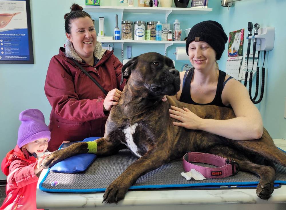 Four-year-old Brielle Swain, Jodi Collum and Danielle Deslauriers appreciatively pat Lylah, a four-year-old bull mastiff, after the dog donated blood at the Neepawa Vet Clinic's Canadian Animal Blood Bank blood drive on Tuesday. (Miranda Leybourne/The Brandon Sun)