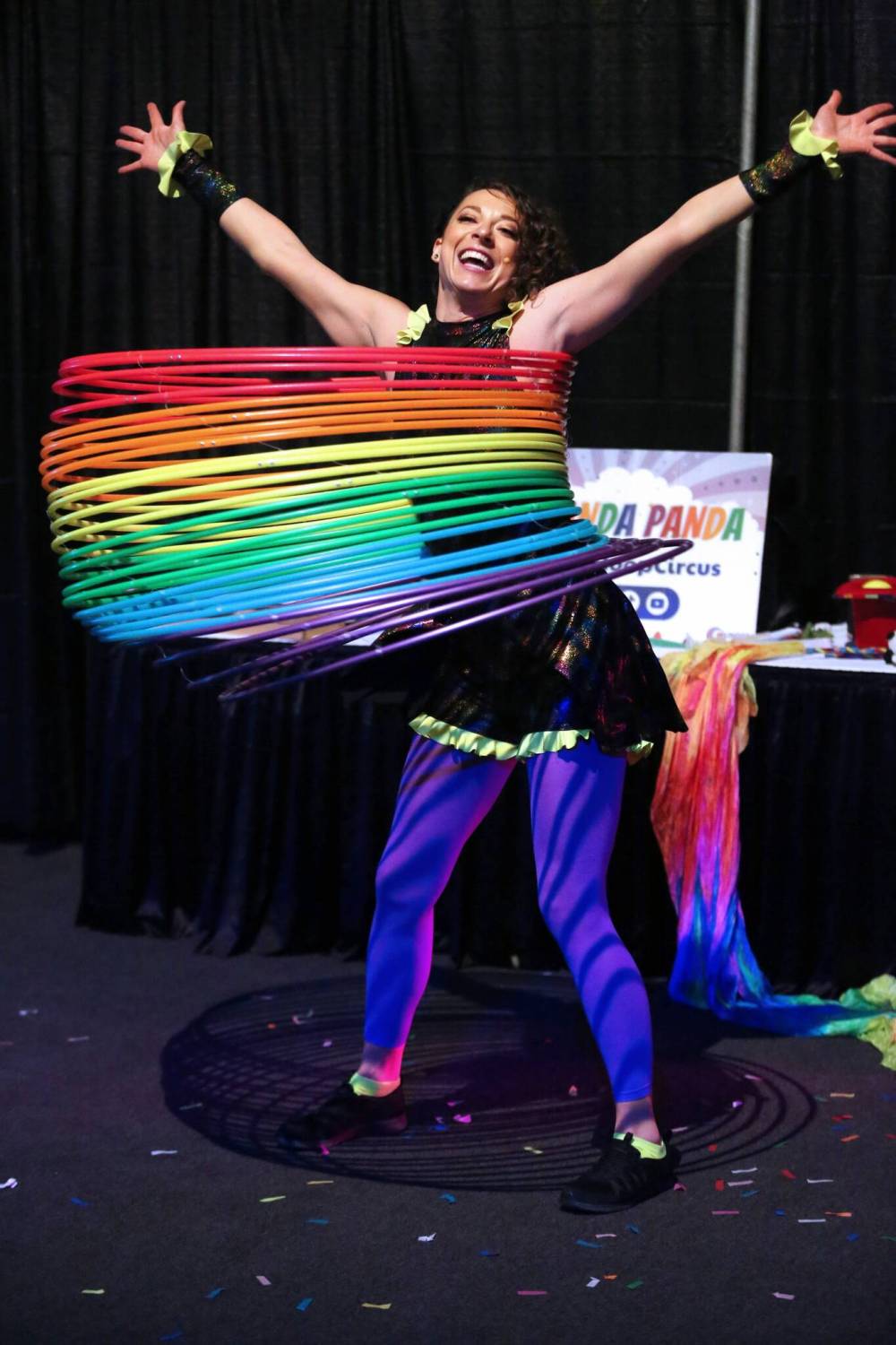 Amanda (Panda) Syryda, the star of the Hula Hoop Circus from Edmonton, does a hoop dance with a giant multi-coloured slinky to close out her early afternoon show on Monday at the Royal Manitoba Winter Fair. (Matt Goerzen/The Brandon Sun)