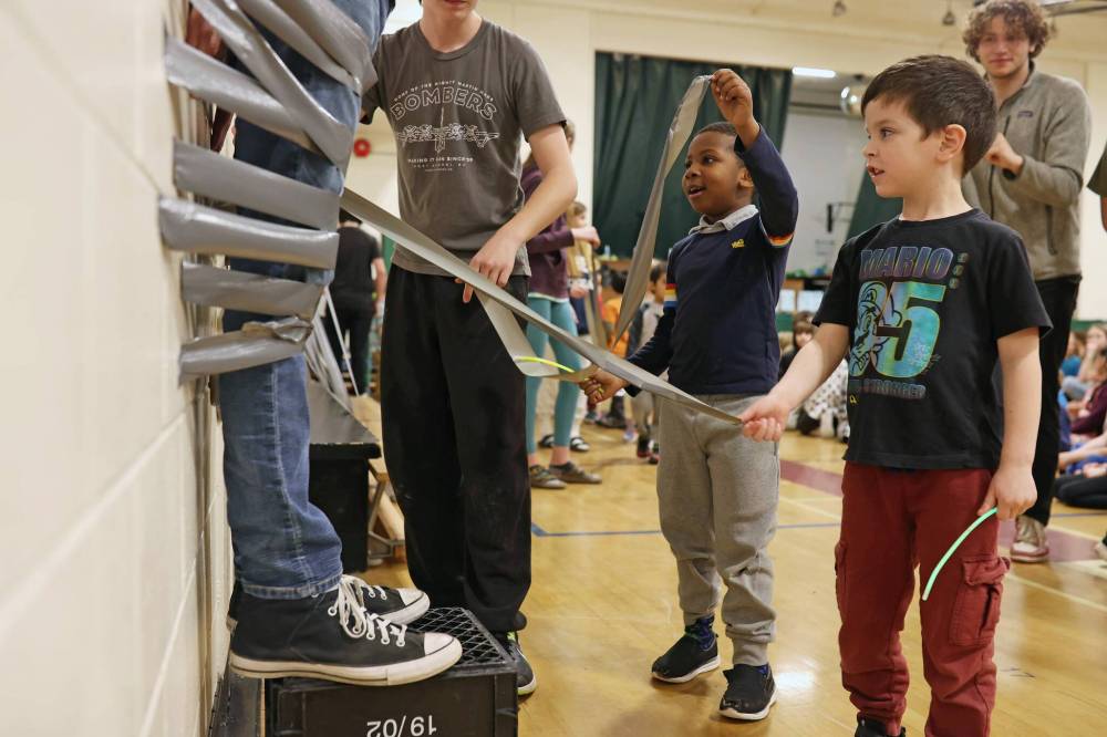 Wednesday afternoon, the school’s gymnasium was packed with about 345 students and dozens of staff members. Along one wall were long pieces of duct tape, and on the stage, chairs were set up covered in garbage bags.