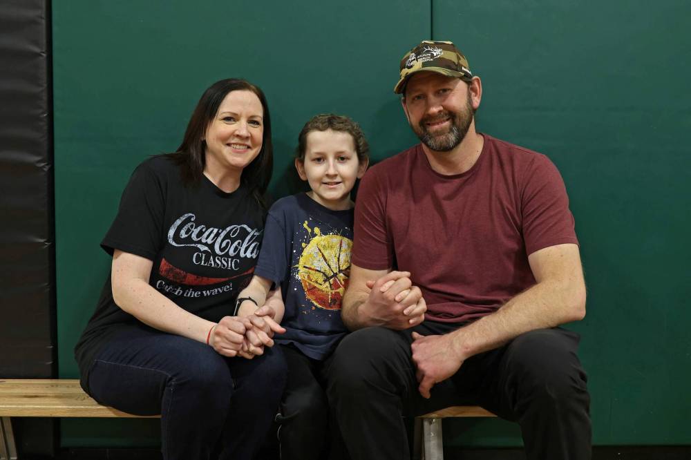Jesse Olson with his parents Amy and Eric during a fundraiser for the family at École Harrison on Tuesday.