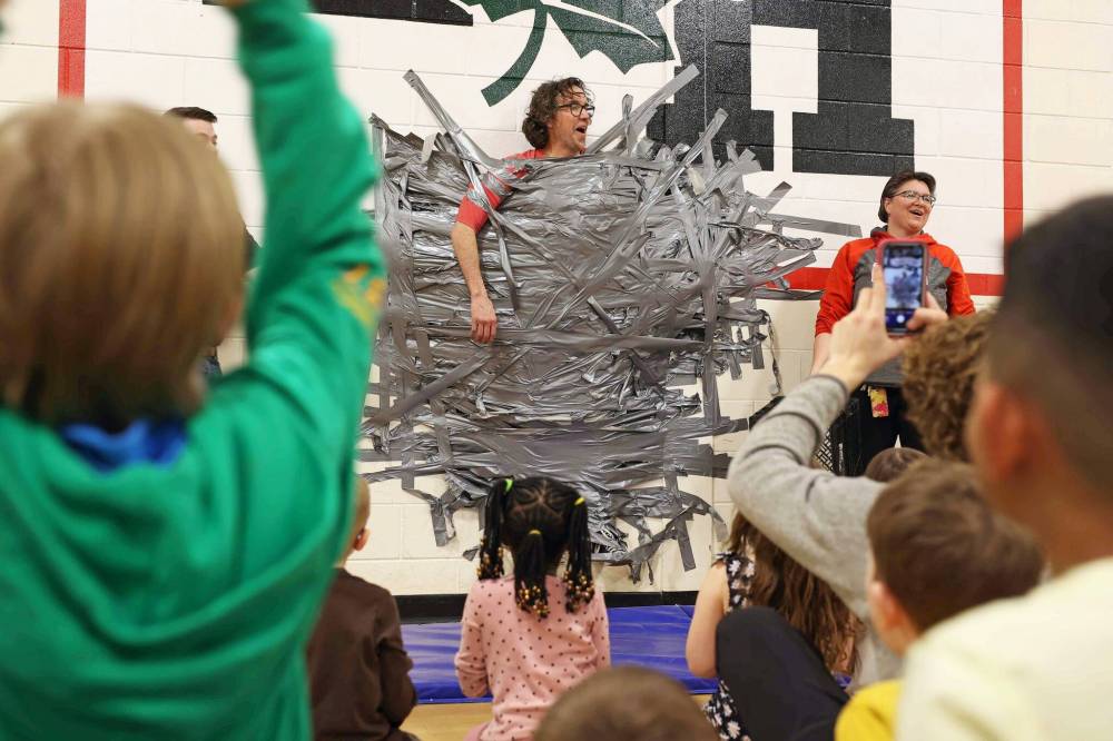 Students at École Harrison duct-tape vice-principal Shawn Lehman to the gymnasium wall.