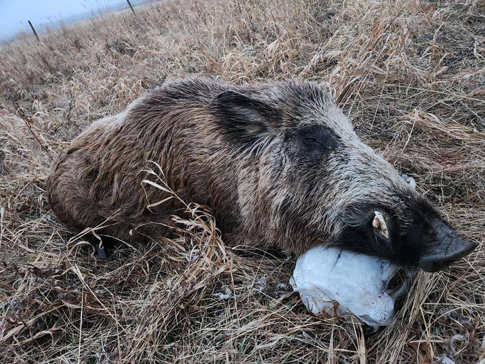 An invasive wild pig harvested by a hunter, with its head resting on a cattle skull. A new study identifies the risk of wild boar spreading south and across the Canada-U.S. border. In Manitoba, most of the animals have been concentrated in and around the Spruce Woods area.