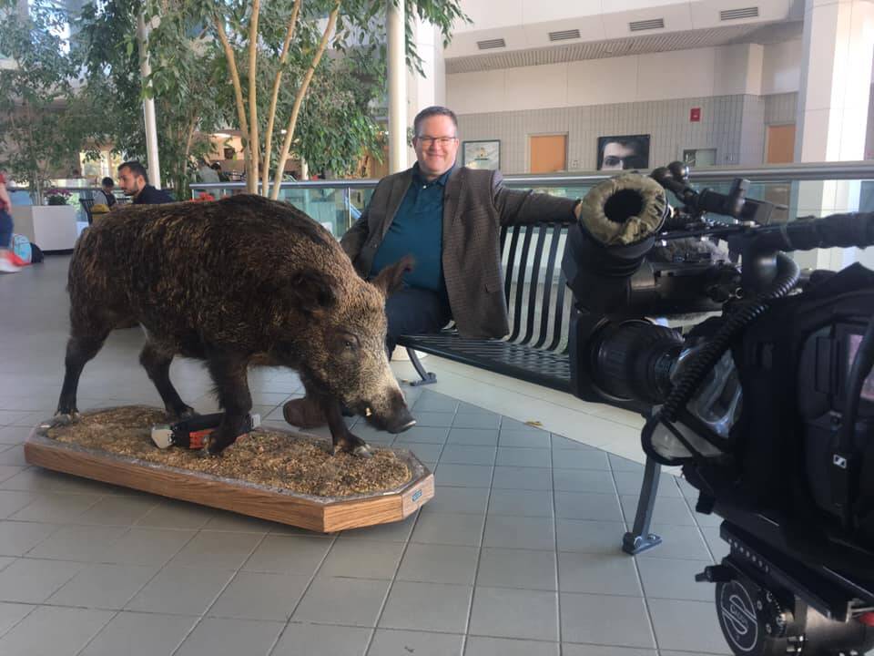 Prof. Ryan Brook, the study’s lead author, seated beside his taxidermied 400-pound invasive wild pig named “Boris Boaraloff” in the College of Agriculture and Bioresources Building in Saskatoon, Sask. (Submitted)