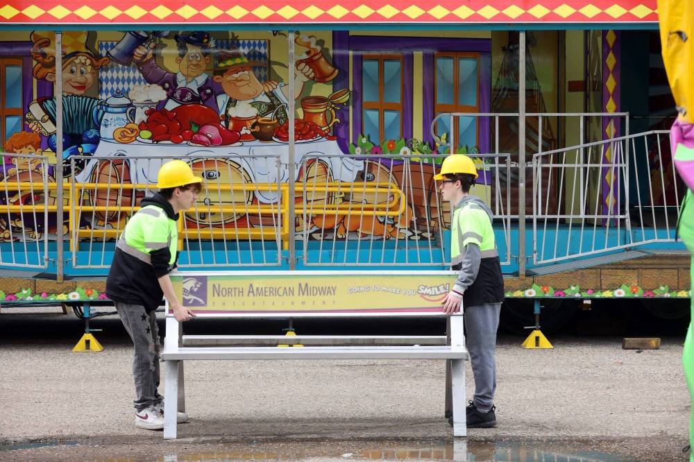 Workers were busy Tuesday setting up for the opening day of the Manitoba Summer Fair at the Keystone Centre grounds. (Tim Smith/The Brandon Sun)