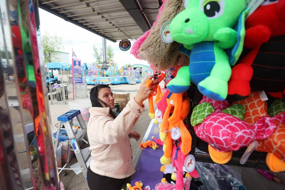Kenzie Wiese sets up prizes for the duck pond midway game in preparation for the opening day of the Manitoba Summer Fair at the Keystone Centre grounds on Tuesday. The annual fair opens this afternoon and runs until Sunday. (Tim Smith/The Brandon Sun)