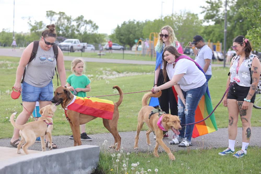 Westman residents and their dogs gather at the Riverbank Discovery Centre grounds to celebrate the official beginning of Brandon Pride Week with a Pooch Pride event in this 2022 photo. Pooch Pride marks the start of this year’s Pride Week on Sunday. (File)