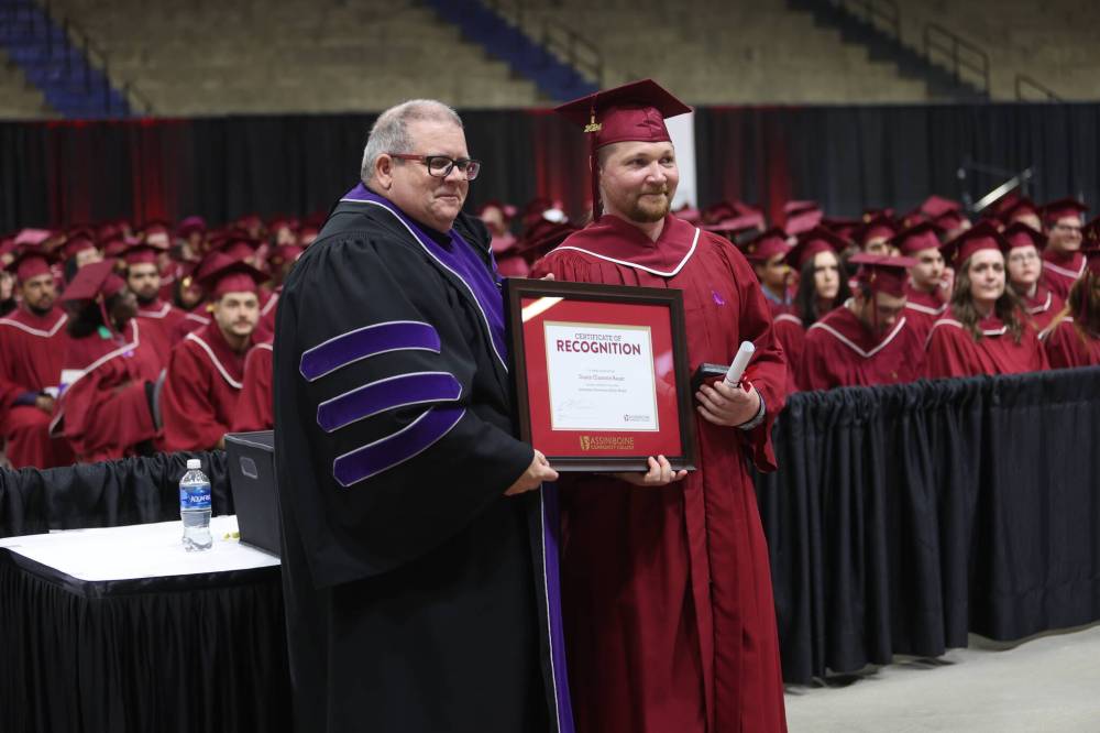 Assiniboine College president Mark Frison (left) presents Lieutenant Governor’s Silver Medal award winner Dustin Bauer with an award for outstanding academic performance during Friday morning’s convocation ceremony at Westoba Place. (Abiola Odutola/The Brandon Sun)