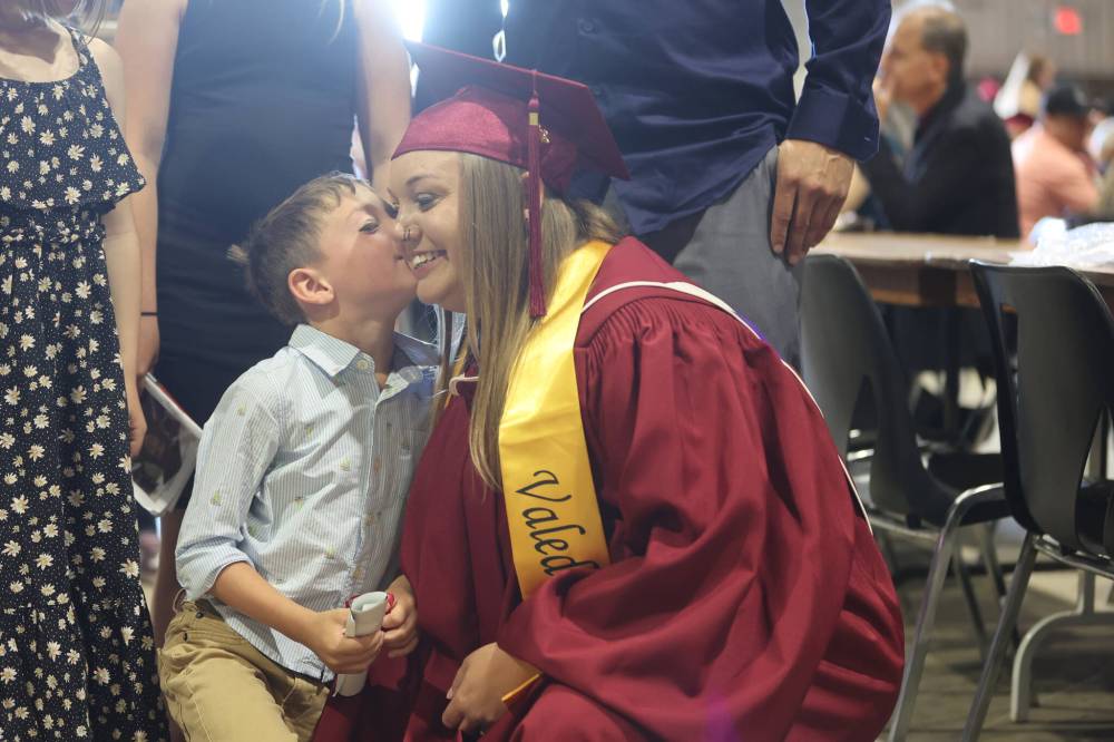 Valedictorian Alycia Canada gets a kiss from her son, Thomas, 6, during Assiniboine College’s convocation ceremony on Friday morning. See story on Page A3. (Abiola Odutola/The Brandon Sun)