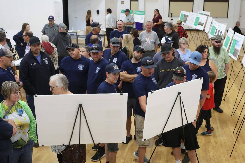 Members of the Carberry North Cypress-Langford Fire Department look over proposals during a public open house and consultation on improvements to the intersection of the Trans-Canada Highway and Highway 5 at the Carberry Community Memorial Hall on Tuesday evening. Carberry NCL Fire Department members were the first responders on scene of Manitoba's deadliest motor vehicle collision on June 15, 2023. (Tim Smith/The Brandon Sun)