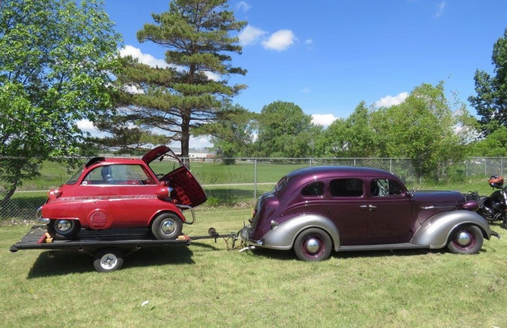 So, he “trailers it” behind another one of his classics — his 1937 Plymouth four-door sedan hotrod. The body is original and has a “350 Chevy engine, power brakes and power steering.”