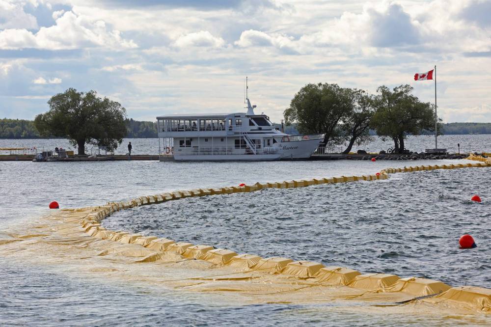 The containment curtain set up to prevent the spread of zebra mussels in Clear Lake is seen last Friday along with the Martese cruise boat at the marina, which is docked for the season as part of the mitigation efforts. (Tim Smith/The Brandon Sun)