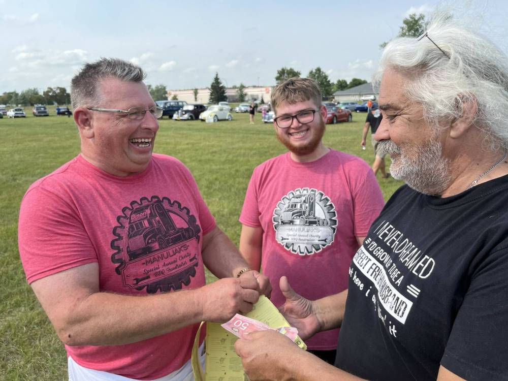 Murray Manuliak (left) and his grandson Alex sell 50/50 tickets to Mark Tricco during the barbecue.