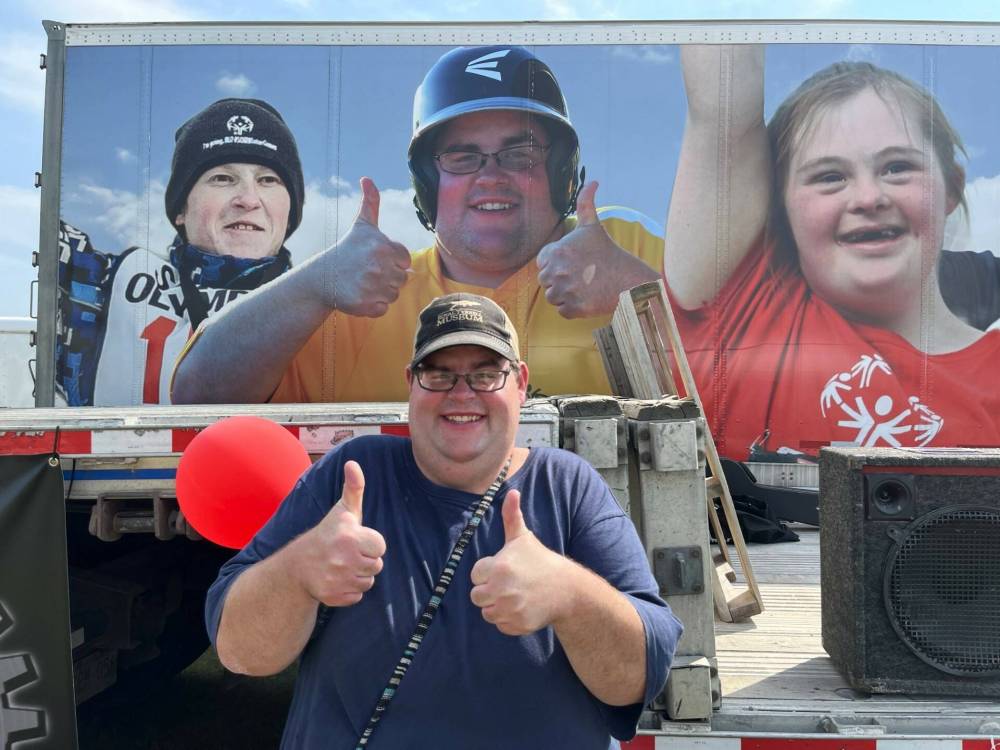 Stephen Campbell, Westman Special Olympian poses in front of the trailer with his photo on it that was taken when he competed in the Special Olympics Canada 2014 Summer Games in Vancouver. Campbell attended the 11th annual fundraising barbecue for Special Olympics, hosted by Murray and Heather Manuliak at the Brandon Riverbank Discovery Centre on Saturday. (Michele McDougall/The Brandon Sun)