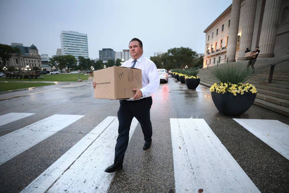 MLA Mark Wasyliw walks out of the Manitoba Legislative Building with a cardboard box Monday afternoon after being removed from the NDP caucus. (Ruth Bonneville/Winnipeg Free Press)