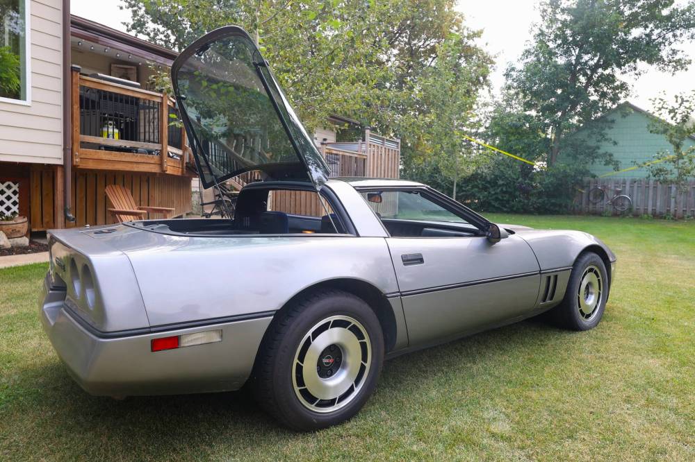 Muirhead’s silver 1984 Chevrolet Corvette C4 with the rear hatchback glass window open.
