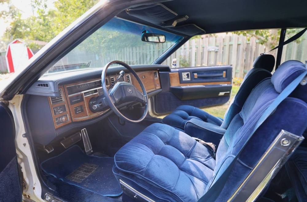 The cobalt blue velvet interior of Muirhead’s white 1980 Cadillac Eldorado.
