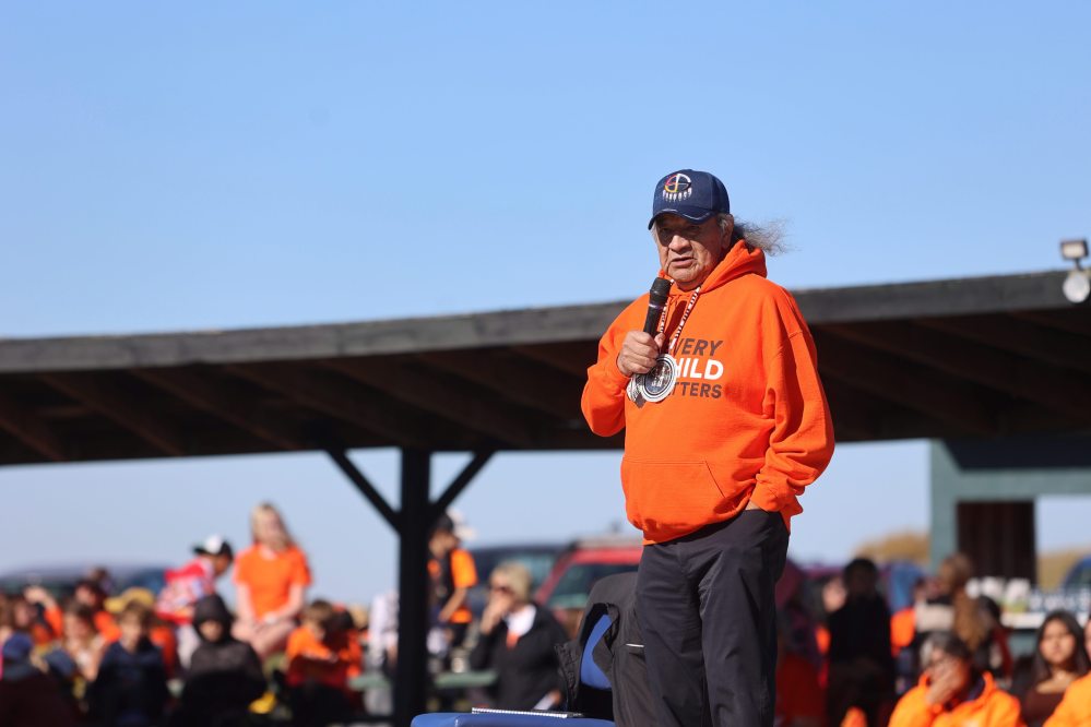 “We had children that went to Dauphin, Lake Manitoba, Brandon, Winnipeg, Portage La Prairie … our families were broken up,” he told the crowd. “And they all came back to the community with different religions. And the reason for that was to break up the family.”