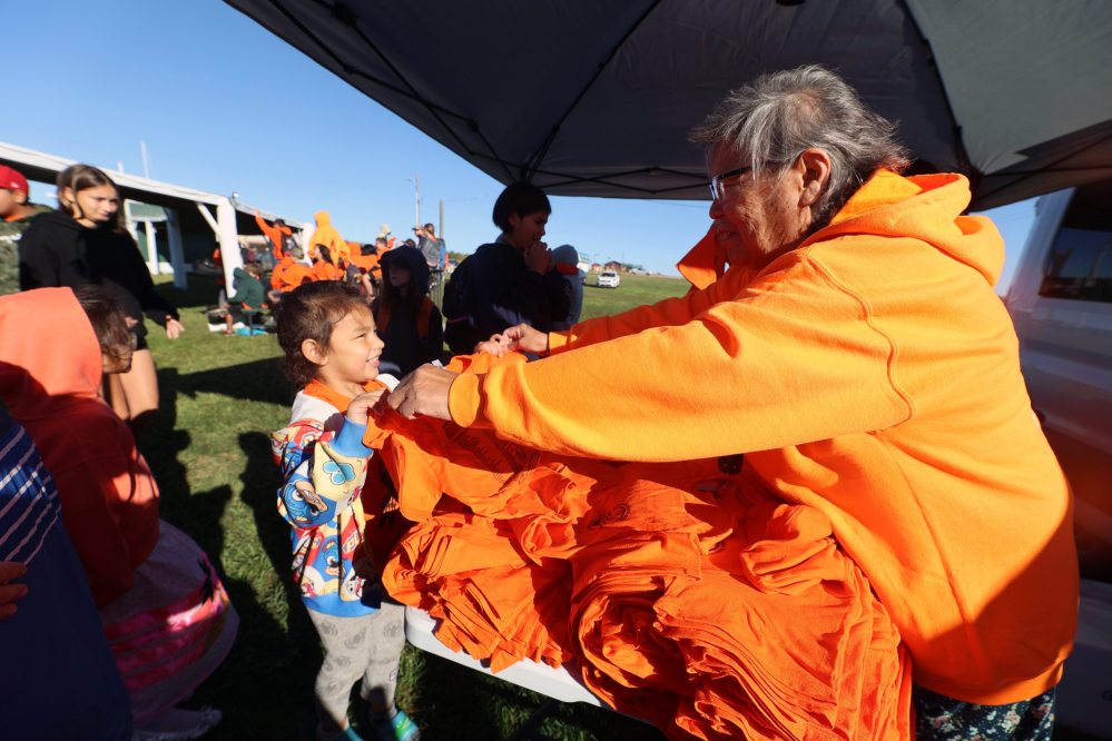 Norma McKay hands out shirts to children during Truth and Reconciliation Day events at the Rolling River First Nation on Friday. (Connor McDowell/Brandon Sun)