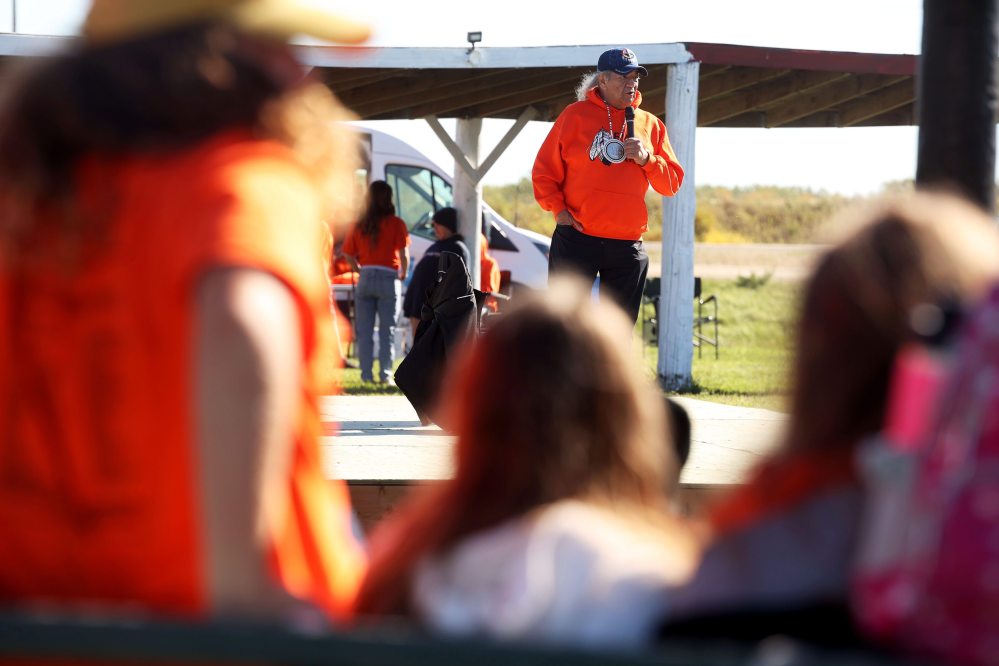 Former 18-year chief of Rolling River First Nation, Dennis White Bird, shares about the damage residential schools did to the community during an event on Friday. The band held a Truth and Reconciliation Day event for students and community members. (Connor McDowell/Brandon Sun)