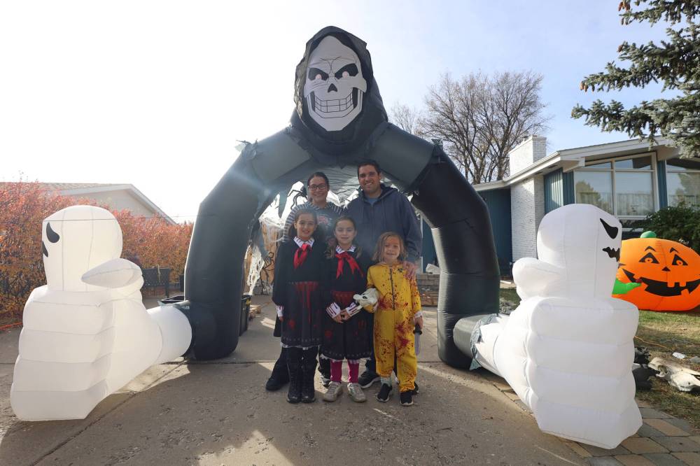 Carla and Mike Mitchell and their daughters Emma, Claire and Hannah show off their haunted house called “Cedar Hollow” on Sunday morning. The family will servr up scares on Oct. 25, 26, 27 and 31 in exchange for food donations for Samaritan House Ministries. (Colin Slark/The Brandon Sun)
