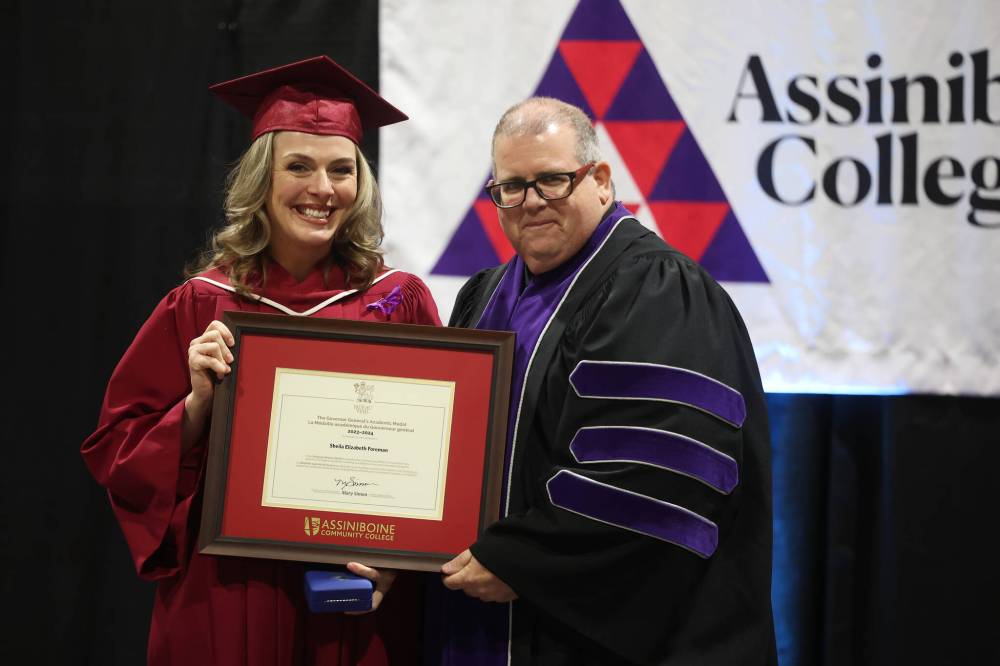 Practical nursing graduate Sheila Foreman is awarded the Governor General’s Academic Medal by Assiniboine College president Mark Frison during the college’s fall graduation ceremony on Wednesday. The medal is presented to the graduating diploma program student with the highest overall average.