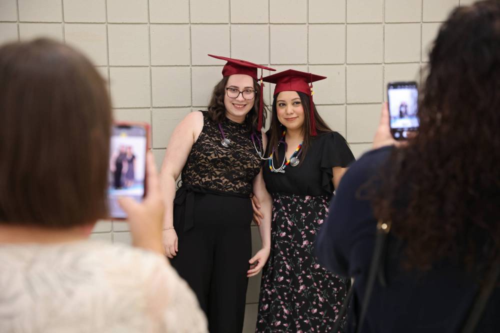 Practical nursing graduates Samantha Nickart and Damaris Quintero pose for photos with their mortarboards and stethoscopes on Wednesday.