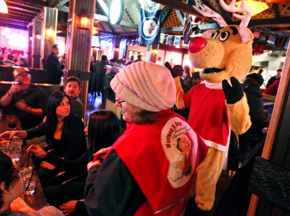 A photo from Dec. 23, 2011 showing an Operation Red Nose volunteer with the organization’s mascot, Rudy in the Tavern United pub, raising awareness about the designated driver program. Operation Red Nose is being cancelled in Brandon this holiday season. (File)