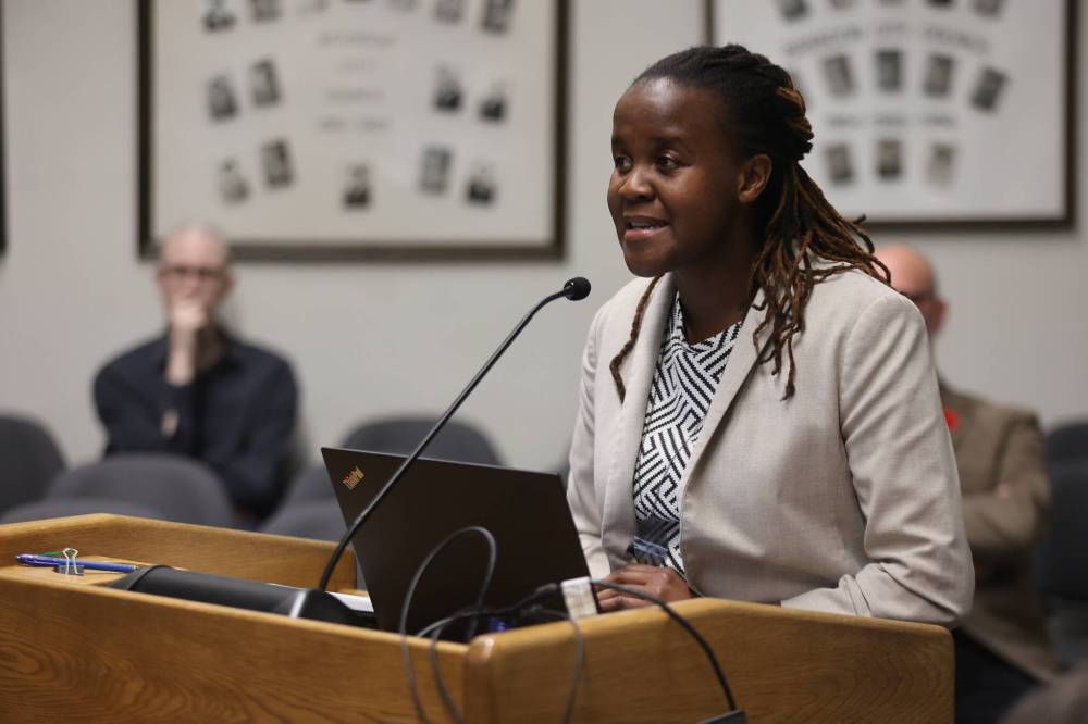 City of Brandon principal planner Sonikile Tembo discusses updates to the new city plan before it received second reading at Monday’s Brandon City Council meeting. (Photos by Colin Slark/The Brandon Sun)