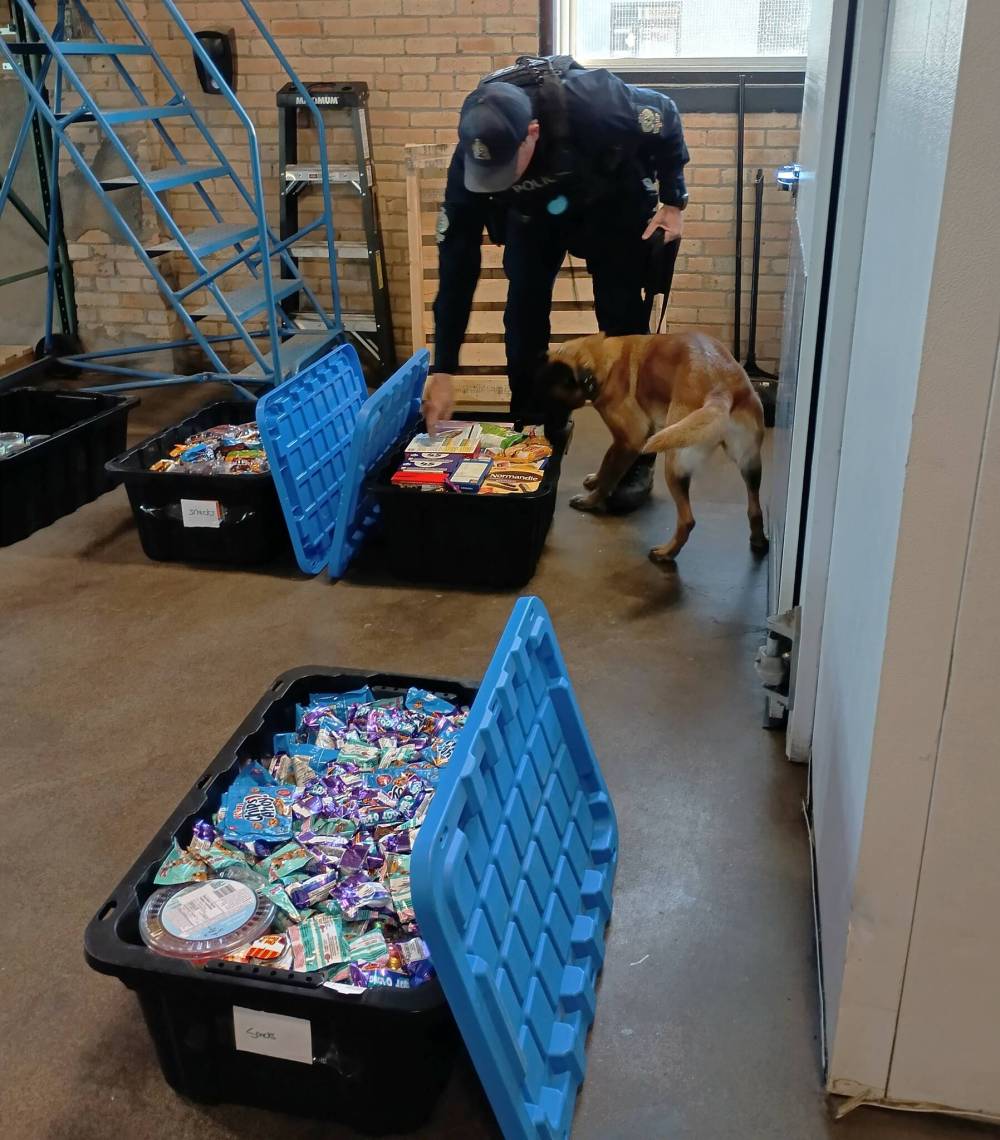 Const. Justin Artibise and his partner Blink, with Brandon Police Service’s Canine Unit conduct a search of the donation bins at Samaritan House Ministries’ food bank after two baggies of drugs were found by a client — inside a box of chocolates, in their food hamper. (Submitted)